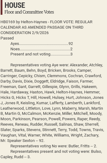 House Representatives passed the bill by a vote of 92–2. Representatives Butler and Fritz voted against the bill; Representatives Bulso, Capley, and Rudd abstained. Supporters of the bill included House Speaker Cameron Sexton and Deputy House Speaker Jason Zachary.