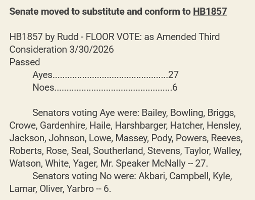 With no further comments, the Senate voted to pass House Bill 1857 with a final vote of 30 ayes and 6 noes. All of the no votes came from Democrats.