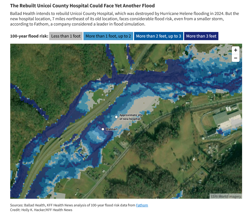 A small Tennessee hospital that was destroyed by a surging river during Hurricane Helene will soon be rebuilt on low-lying farmland that could face several feet of flooding in a much smaller storm, risking another disaster if the new facility is not built to withstand extreme weather, according to a KFF Health News analysis.