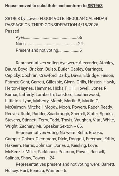 The companion Senate Bill (SB1968) as amended was substituted for House Bill 1823 which was sponsored by Representative Kevin Raper (R-Cleveland-District 24) with Representatives Scott Cepicky (R-Culleoka-District 64), Kirk Haston (R-Lobelville-District 72), and Mark White (R-Memphis-District 83) signed on as co-sponsors.