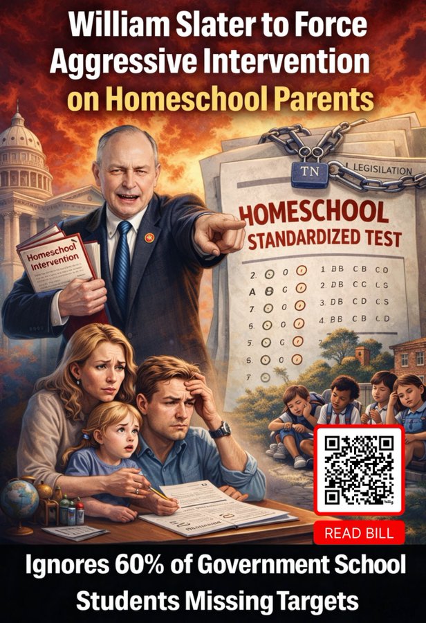 Home School Parents, if you aren’t aware, TN Rep William Slater (615) 741-2534 is planning to force certain homeschool students back into public schools with HB1729 based on invasive testing he hopes to mandate – despite the fact 60% of government school students are failing to meet standards, he’s mainly concerned with what YOU do in YOUR home.